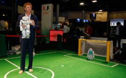 Ubbo Visser, an associate professor of computer science, demonstrates the autonomous, programmable robots used by his students to compete in international robotics competitions. The mechanical humanoid drones of the University of Miami's RoboCanes soccer team were a crowd pleaser on the first day of the eMerge Americas Techweek Expo and Summit in Miami Beach, drawing curious onlookers enamored by all things tech.
